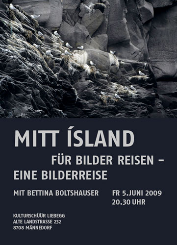 Im Rahmen ihres Fotografiestudiums an der Hochschule für Gestaltung und Kunst Zürich (heutige ZHdK) absolvierte Bettina Boltshauser ein Gastsemester an der isländischen Kunsthochschule in Reykjavik und lebte während einem halben Jahr in Island. Während dieser Zeit hat sie das Land intensiv bereist und fotografiert. Die Insel aus Feuer und Eis, wo die Gegensätze kaum grösser sein könnten hat die junge Fotografin tief berührt. Die Leidenschaft, die sie für die isländische Landschaft und Natur verspürt möchte sie am Freitag 5.Juni in der Kulturschüür Männedorf mit ihrer Diapräsentation mit Interessierten teilen.