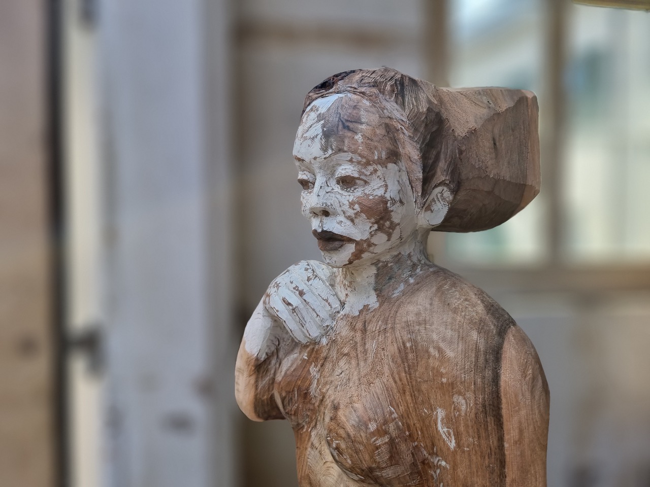 Sind die im kraftvollen, rohen Duktus der Kettensäge aus einem Stück gearbeiteten meist figürlichen Skulpturen von Karin Hofer einerseits von Humor und Ironie getragen, werfen sie andererseits ernste Fragestellungen zum Mensch sein auf. Das Momentum emotionaler - körperlicher Bewegung in der Skulptur festzuhalten ist eine ständige und spannende Herausforderung.