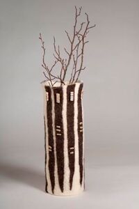 Nun gestalte ich den Filz zu einem dreidimensionalen Objekt. Die Möglichkeiten diese zu besticken, mit der Nähmaschine zu verzieren oder mit anderen Wollfasern zu ergänzen, sind grenzenlos. So sind meine Gefässe und die dreidimensionalen Bilder entstanden.