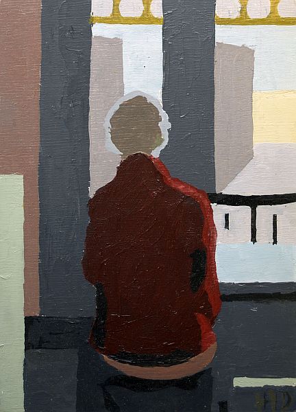 Ich arbeite nach der äusseren Anschauung und zeichne mir meist in kleinem Format auf, was mir im Alltag eine Bildidee gibt und mache mir Notizen dazu. Zuhause übertrage ich die Zeichnung auf eine grössere Leinwand und in letzter Zeit auch auf kleinere Formate auf Sperrholzplatten und male das Bild mit Ölfarben nach den Notizen und aus der Erinnerung.