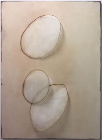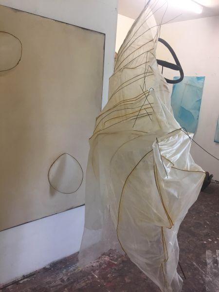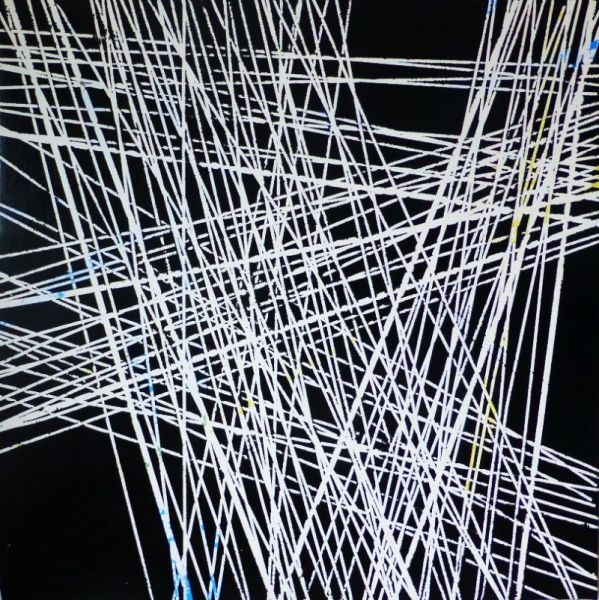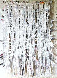 Lines and Spaces. Sie arbeitet mit Acryl und Alltagsmaterialien: Zeitungen, Klebebändern, die sie